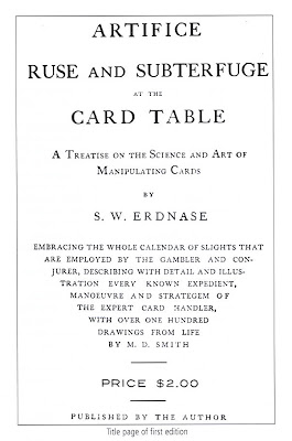 Or rather, the man who, under that name, wrote the classic book on card handling , which is generally published as "The Expert at the Card table," although the original title was "Artifice, Ruse and Subterfuge at the Card Table a Treatise on the Science and Art of Manipulating Cards...... " Erdnase enthusiasts in the online magic forums refer to it simply as "The Expert " or "Erdnase", as if the book were the man.